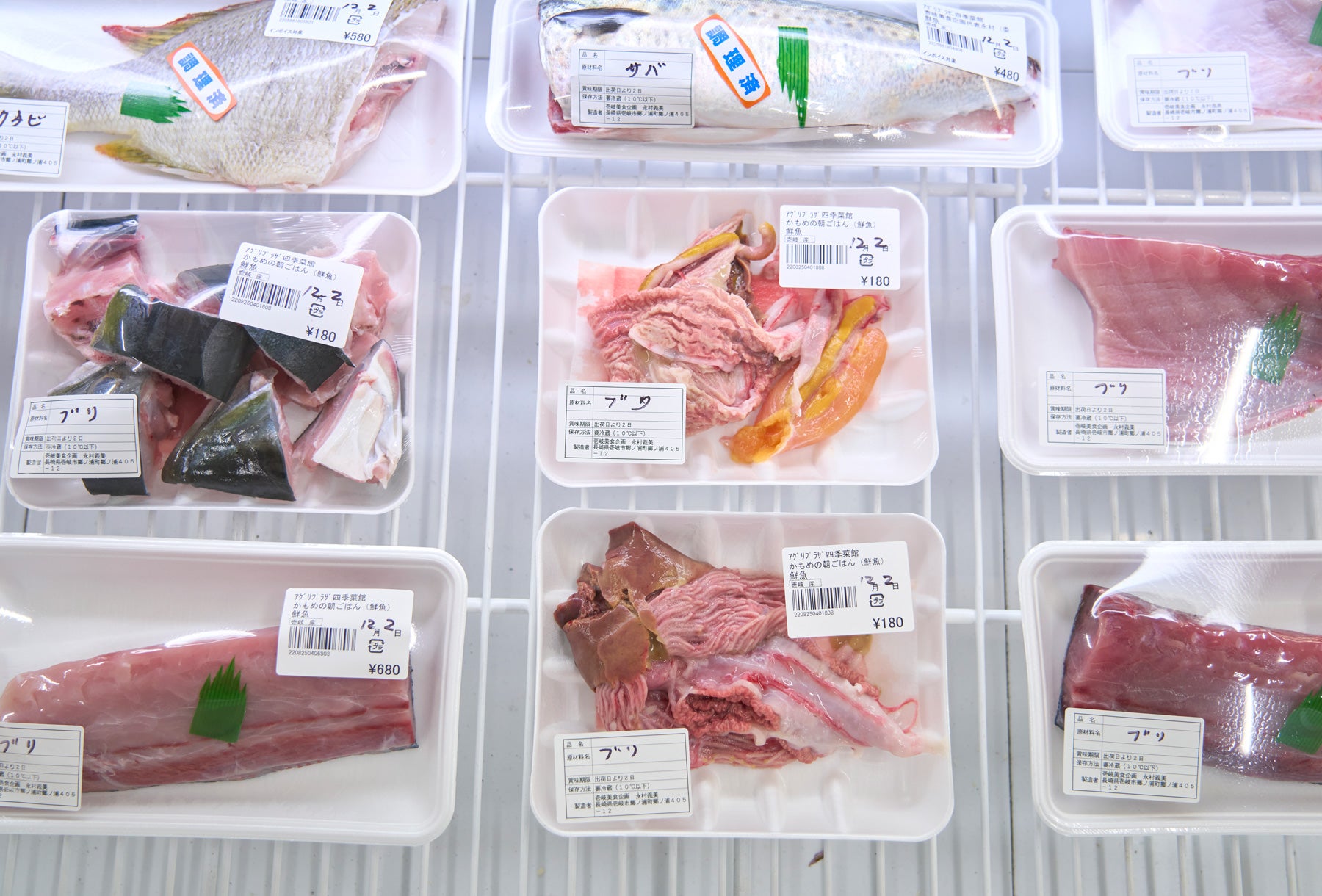 小坂さんは「壱岐のスーパーや直売所では、ぶりわたが1パック100円台で売られている」とも話していたので、早速スーパーに調査に来てみたら…ぶりわたは切り身と並んで当たり前のように売られていた。これは一体どこの部位で、どうやって調理すればぶりわた汁となるのだろう。
