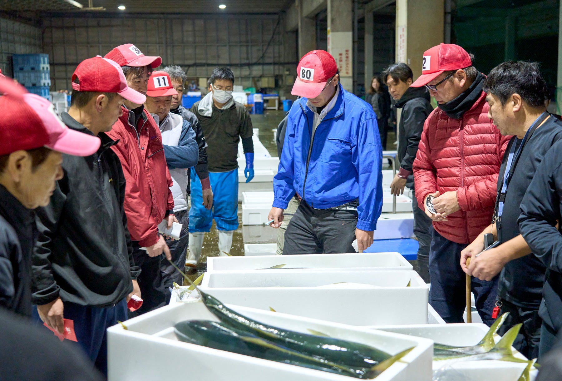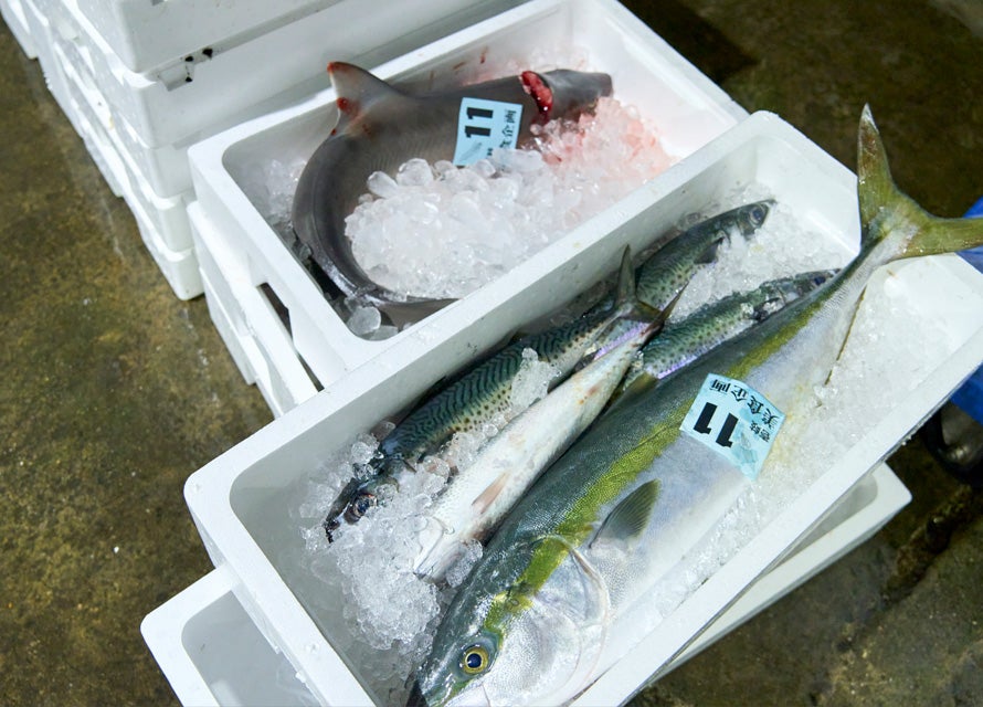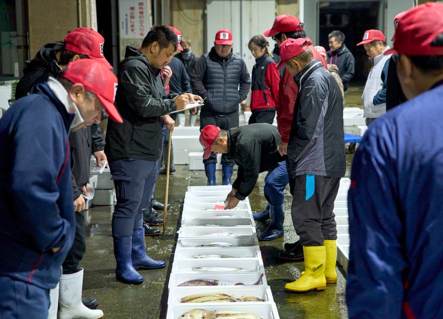 私たちは永村さんの案内で競りの様子を見学させてもらった。アオリイカ、クチビ、サワラ、カマス、アカバナ…。トロ箱を指しながら魚種を教えてくれる永村さんの足が止まった先には、丸々と肥えたぶりがあった。だが、永村さんは「まだ小さい」とつぶやく。いわゆる“寒ぶり”と呼ばれる脂が乗り切った10kg以上のものは、クリスマスを過ぎてからでないと揚がってこないらしい。