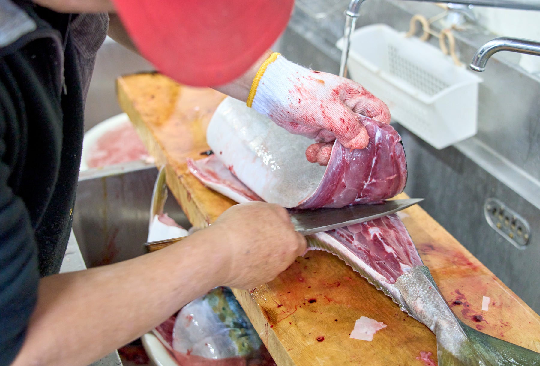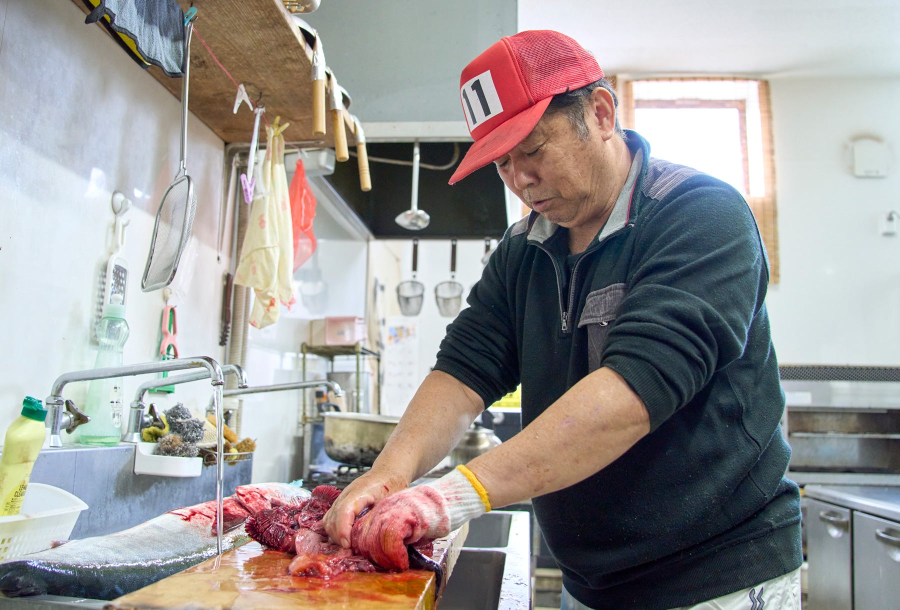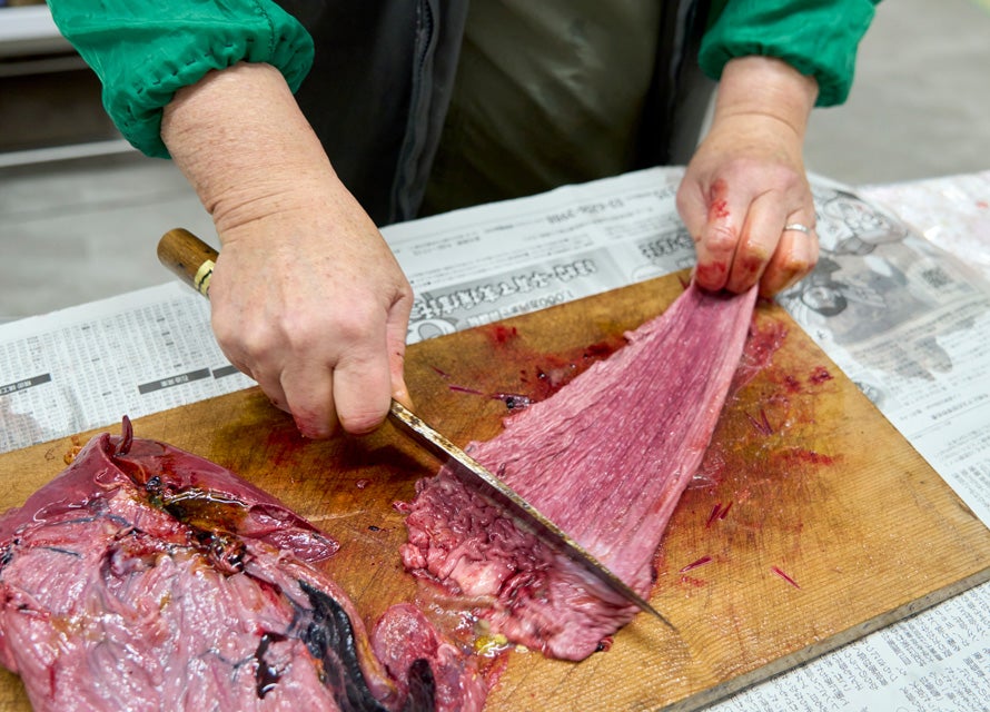 永村さんにぶりの解体を見せてもらう。ぶりの身やカマの味がいいのは周知の通りだが、「そのほかの部位も旨い。ぶりは捨てるところがほとんどない」と永村さんは言う。ザクッ、ゴリッと響く包丁の音とともに、ぶりは次々と部位ごとに分けられていく。エラは血をよく洗い落としてしゃぶしゃぶに、卵巣は煮付けやカラスミに使う。腹からはぷりぷりとした腸やふかふかの肝が出てきた。