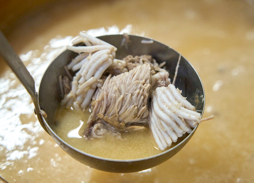 完成したぶりわた汁は、最初に食べたものとも、永村さんのものとも違っていた。松熊さんのぶりわた汁は部位ごとの味の違いはほとんど感じず、すべてが同化したようなまったりとした味わいだ。それもそのはず、内臓はついさっきまで一塊の臓器としてぶりの体内に存在していたのだ。血抜きしたぶりわたと、捌いてすぐのぶりわた、どちらも異なる滋味がある。作る人によってこうも味が変わるものなのかと、郷土料理の奥深さを知る。