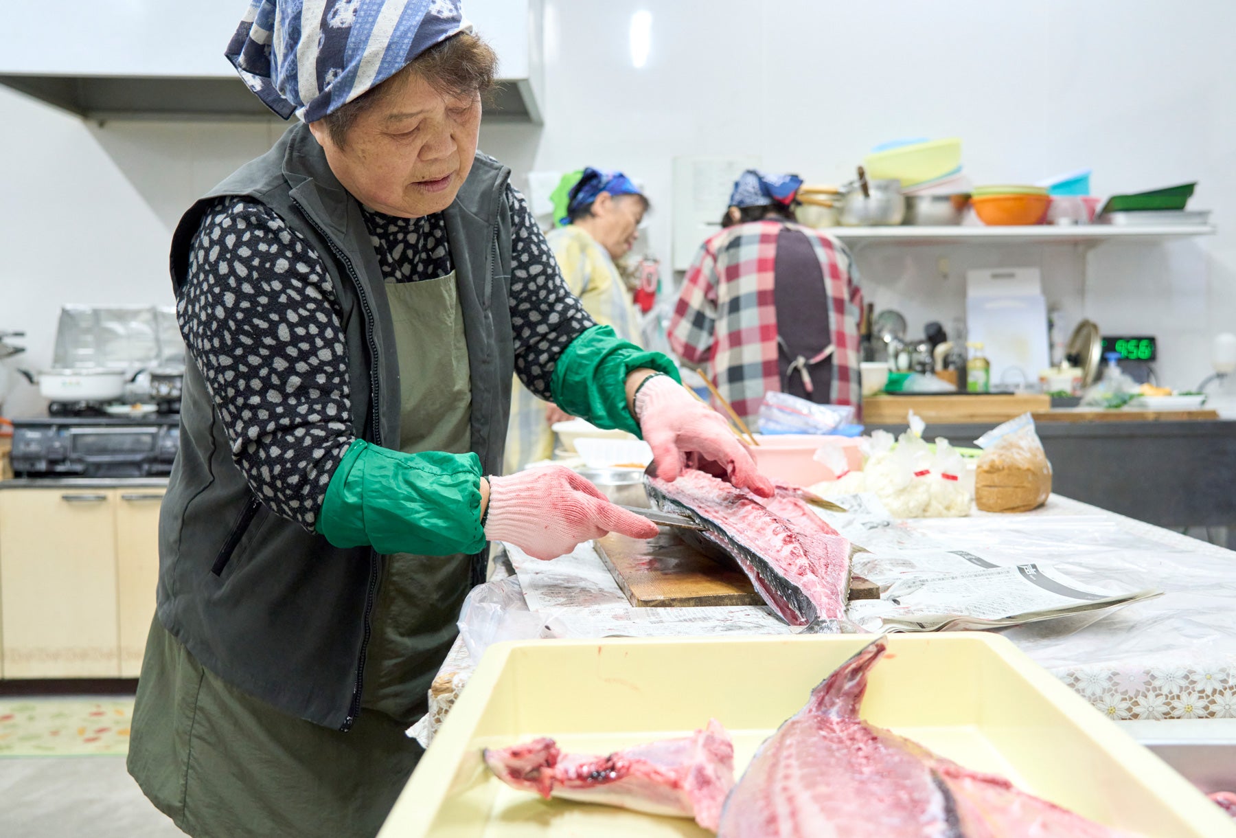 松熊さんは仕出し屋で10年調理の腕を奮った料理上手。ぶりを捌くのもお手のものだと聞き、松熊さん流のぶりわた汁を食べさせてほしいとお願いしていたのだ。この日、松熊さんが用意してくれていたぶりは約7kg。「今年のぶりはなかなか大きくならんねえ」とおしゃべりしながら、松熊さんは慣れた手つきで包丁を動かしていく。