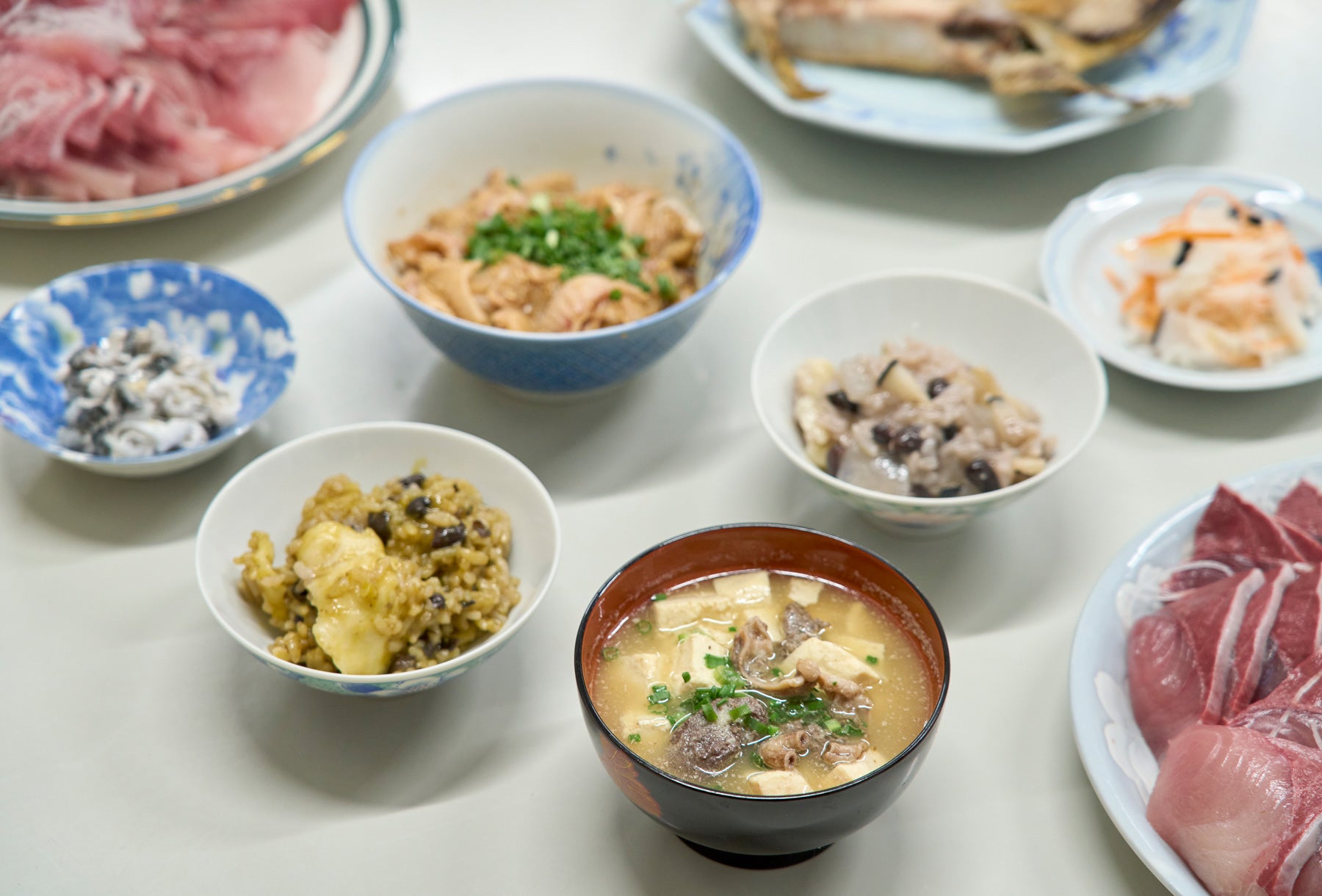漁師料理といえば豪快さが持ち味だと思い込んでいたが、ぶりわた汁に関しては細やかで入念な下処理が味の決め手のようだ。永村さんが作ってくれたぶりわた汁は、最初に食べたものとはまた違う。材料はぶりの内臓、味噌、小ねぎのみ。ぶりから旨味が出るため、だしは必要なく、味噌は米と麦の2種類を使う。