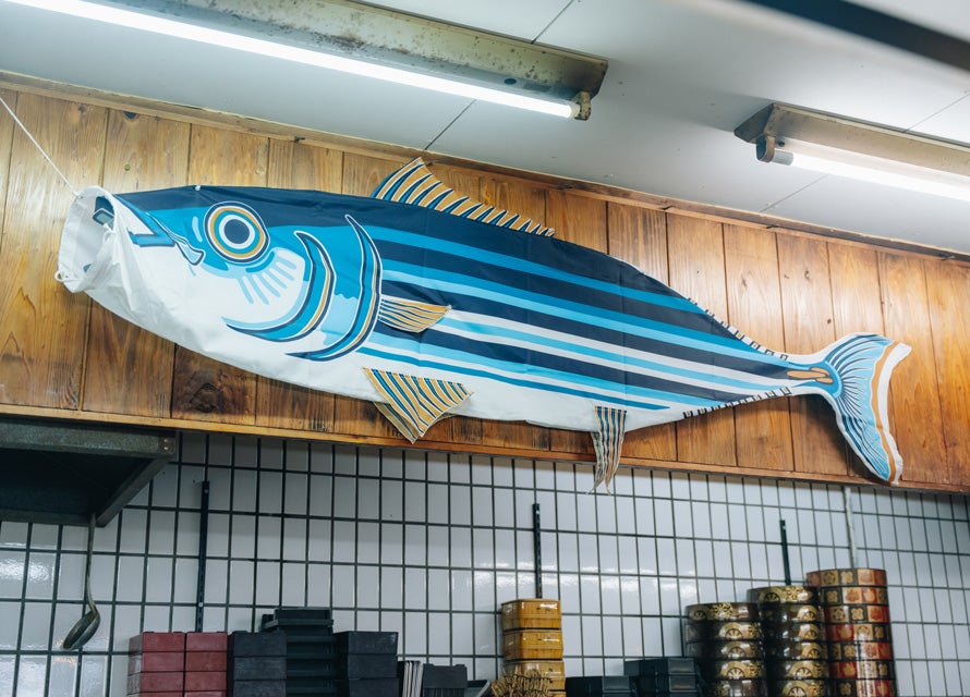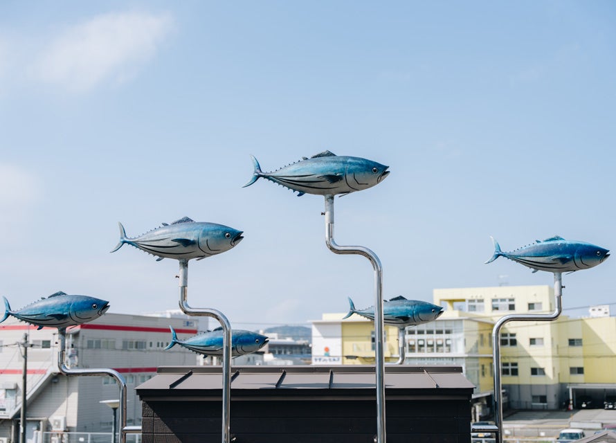 枕崎市は鹿児島県・薩摩半島の南端に位置し、東シナ海に臨む港町だ。車の窓を開けると、朝の爽やかな風に乗ってスモーキーな香りが漂ってくる。これはきっと、かつお節を燻しているにおいだろう。漁港には鯉のぼりならぬ"かつおのぼり”がはためき、道端にはかつおのモニュメントがあり、水飲み場までかつおがモチーフのデザイン。かつおへの愛がすごい。お隣の熊本県では「まちを歩けばくまモンに当たる」と聞くが、枕崎もかつおの密度では負けていないかもしれない。まさに“かつおのまち”と呼ぶにふさわしい。