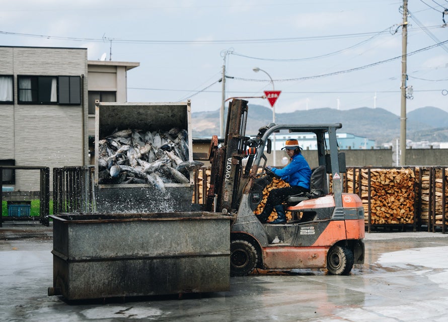 森「あれは、かつおを燻すのに使う薪です。カシやクヌギ、コナラが主で、いずれも近隣の山から切り出された間伐材です。枕崎には“かつお節作りは山作り”という言葉があり、地域の林業と連携して山の資源を守ることで薪の安定した供給が可能になっています。枕崎がかつお節の産地となった大きな理由は、地域で薪を大量に調達できたことにあるでしょう」