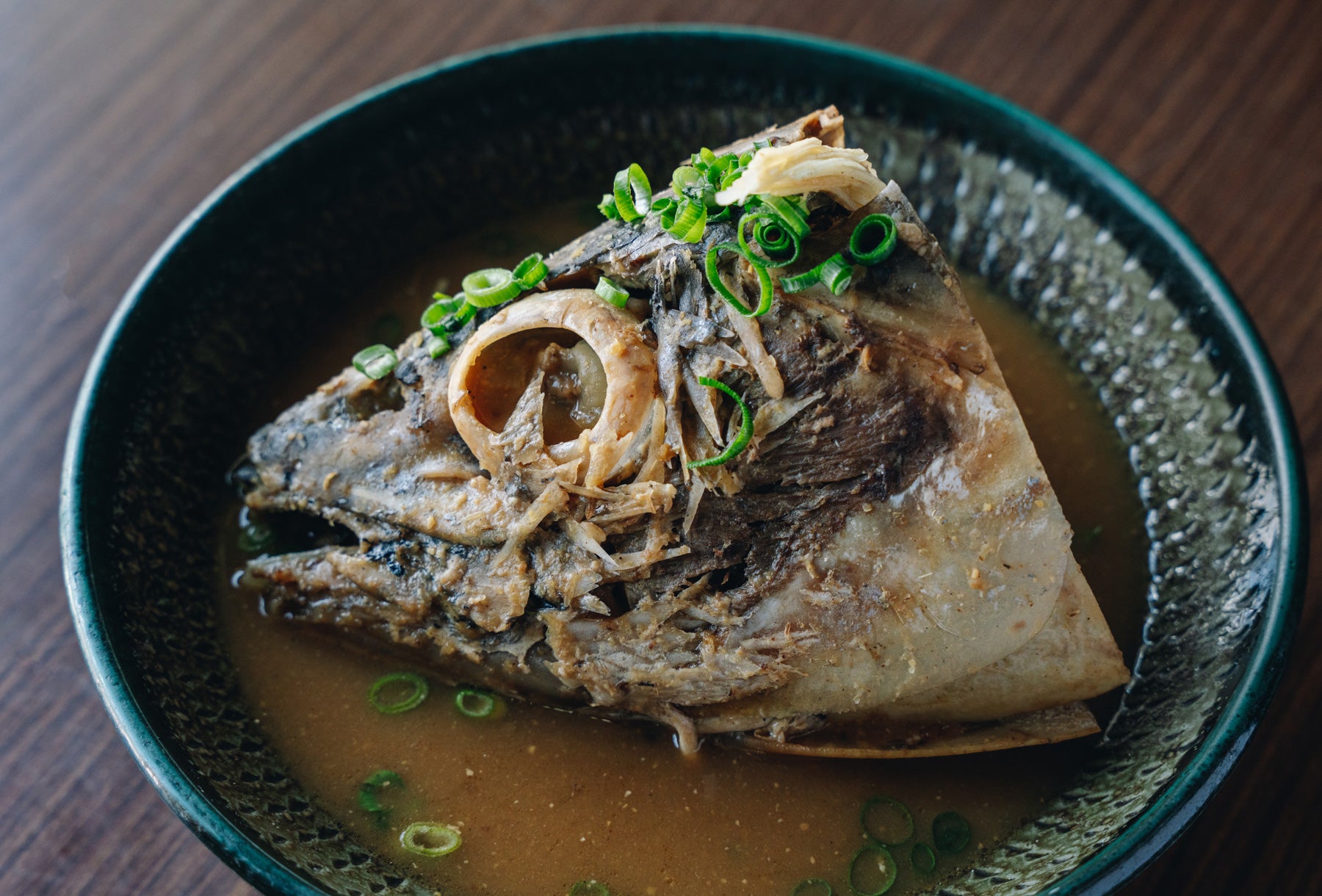 そしていよいよビンタ料理が登場。4~5kgほどのかつおの頭を味噌煮にして、大鉢に丸ごと盛り付けた豪快さ! 枕崎では古くからおもてなしの料理とされ、来客時や祝いの席で分け合いながら食べられてきたそうだ。身がしっとりとやわらかく煮てあり、特に目の周りはプルンとした食感で美味である。